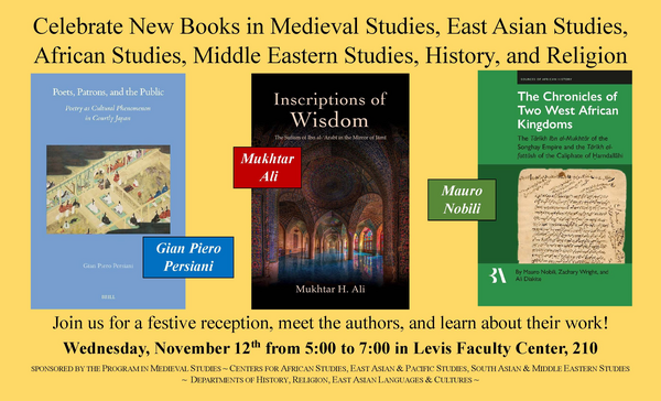 Join us for a festive reception to celebrate three new books published this fall! The authors will each offer brief remarks and there will be an informal Q&A about the research and writing process. All are welcome! Co-sponsored by the Departments of History, Religion, and East Asian Languages and Cultures; and the Centers for African Studies, East Asian and Pacific Studies, and South Asian and Middle Eastern Studies.