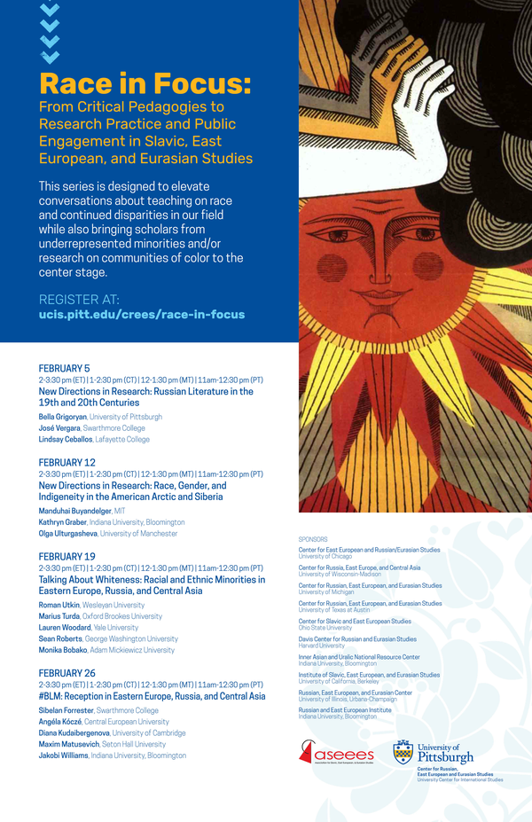 Spring 2021 sessions will take place on Fridays in February. For more information, please see https://www.ucis.pitt.edu/crees/race-in-focus