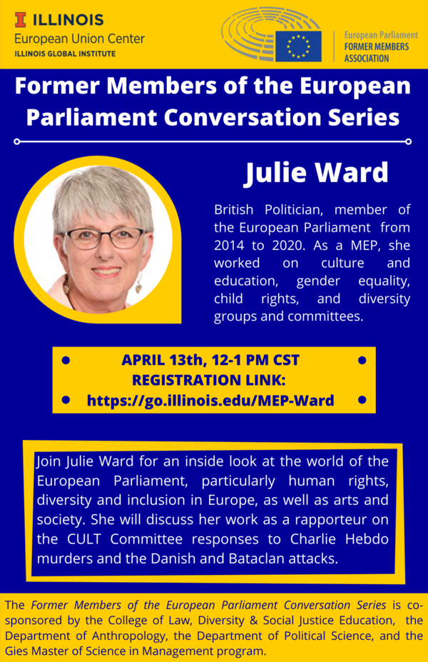 Please join the EU Center on April 13 at 12 P.M. CDT for a moderated conversation with Julie Ward, a British Politician and member of the European Parliament from 2014 to 2020. As a MEP, she worked on culture and education, gender equality, child rights, and diversity groups and committees. Join her for an inside look at the world of the European Parliament, particularly human rights, diversity and inclusion in Europe, as well as arts and society. She will discuss her work as a rapporteur on the CULT Committee responses to Charlie Hebdo murders and the Danish and Bataclan attacks.Register for this event here: https://go.illinois.edu/MEP_Ward