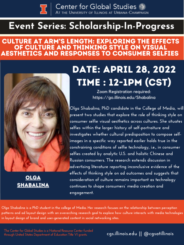 Olga Shabalina, PhD candidate in the College of Media, will present two studies that explore the role of thinking style on consumer selfie visual aesthetics across cultures. She situates selfies within the larger history of self-portraiture and investigates whether cultural predisposition to compose self- images in a specific way reported earlier holds true in the constraining conditions of selfie technology, i.e., in consumer selfies created by analytic U.S. and holistic Chinese and Russian consumers. The research extends discussion in advertising literature reporting inconclusive evidence of the effects of thinking style on ad outcomes and suggests that consideration of culture remains important as technology continues to shape consumers’ media creation and engagement.