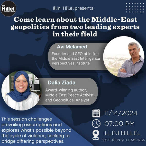 This Thursday, November 14, at 7 p.m., Illini Hillel is hosting a conversation between Avi Melamed, a former Israeli intelligence official and analyst, and Dalia Ziada, a Middle East peace activist and geopolitical analyst from Egypt. As co-speakers, Middle East experts Dalia Ziada and Avi Melamed offer a unique and compelling perspective derived from their diverse backgrounds and extensive experience on the geopolitics of the Middle East. Their insider knowledge, which genuinely covers Arab and Israeli perspectives, is invaluable to the American audience at university campuses and community gatherings, who are struggling with understanding the perplexing dynamics of the ongoing Israel-Hamas war and its extending impact on the United States and the Western world.