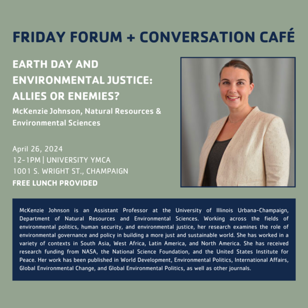 McKenzie Johnson is an Assistant Professor at the University of Illinois Urbana-Champaign, Department of Natural Resources and Environmental Sciences. Working across the fields of environmental politics, human security, and environmental justice, her research examines the role of environmental governance and policy in building a more just and sustainable world. She has worked in a variety of contexts in South Asia, West Africa, Latin America, and North America. She has received research funding from NASA, the National Science Foundation, and the United States Institute for Peace. Her work has been published in World Development, Environmental Politics, International Affairs, Global Environmental Change, and Global Environmental Politics, as well as other journals.