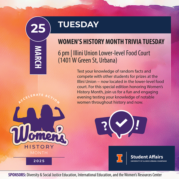 Test your knowledge of random facts and compete with other students for prizes at the Illini Union - now located in the lower-level food court. For this special edition honoring Women's History Month, join us for a fun and engaging evening testing your knowledge of notable women throughout history and now.