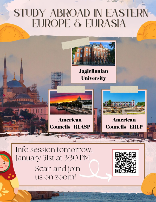 Learn about study abroad in Eastern Europe/Eurasia, in this online zoom session hosted Tuesday, January 31st at 3:30PM!
