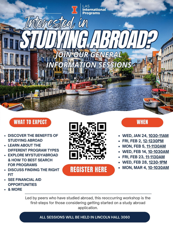 This information session, hosted by LAS International Programs interns and past study abroad alumni Stephanie Lepak (studied in Asturias, Granada, Spain and Rome, Italy), Gabby Contreras (studied abroad in Granada, Spain) and Annie Yang (studied abroad in Vienna, Austria) who will guide LAS students through the beginning steps of studying abroad. Students can learn more about planning for study abroad, finding a program, financial aid, study abroad advising, applying, and more! Students are recommended to come prepared with questions, any program-specific inquiries will be directed towards LASIP advisors.