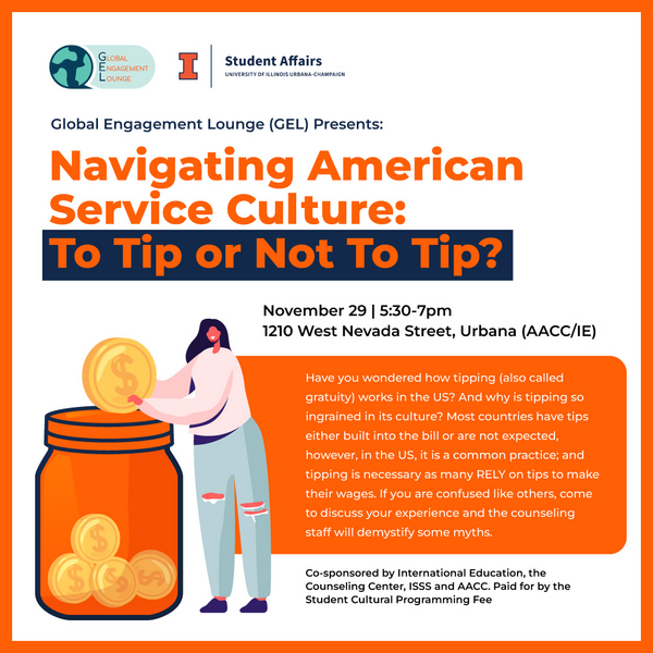 Have you wondered how tipping (also called gratuity) works in the US? And why is tipping so ingrained in its culture? Most countries have tips either built into the bill or are not expected, however, in the US, it is a common practice; and tipping is necessary as many RELY on tips to make their wages. If you are confused like others, come to discuss your experience and the counseling staff will demystify some myths. Dinner is provided. Paid for by the Student Cultural Programming Fee (SCPF).