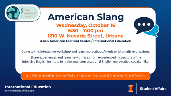 What are some of the latest slang expressions and idioms in English? Have a hard time understanding conversations because of slang? Come to this interactive workshop and learn more about American idiomatic expressions. Share experiences and learn new phrases from experienced instructors of the Intensive English Institute to make your conversational English more native-speaker like! All are welcome. Dinner is provided.