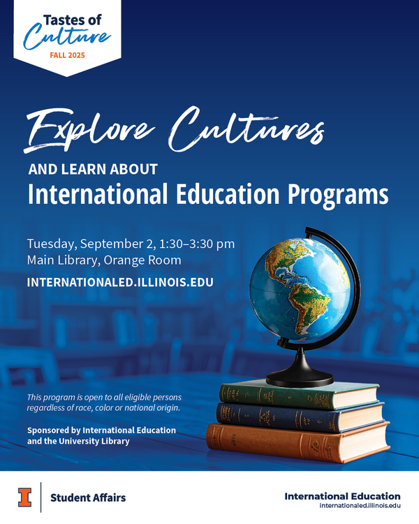 Welcome (back) to campus! Enjoy some international snacks and drinks with cross-cultural learning activities. Sponsored by International Education and the University Library. This program is open to all current students, regardless of race, color or national origin. Reasonable accommodations are available upon request, please contact internationaled@illinois.edu