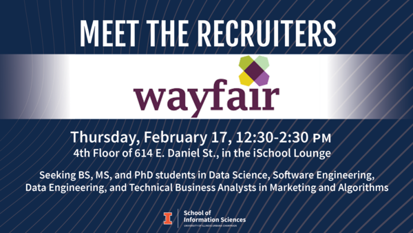 BS, MS, and PhD Students Meet us in the iSchool Lounge on the 4th floor of 614 E. Daniel to chat with Wayfair's data and software engineers, as well as one of our recruiters after our visit to IS 199 at the iSchool to learn more about our opportunities, culture, and open roles! We have openings in Data Science, Software Engineering, Data Engineering, and Technical business analysts in Marketing and Algorithms. Make sure to grab some Wayfair branded swag as well, We look forward to meeting you!
