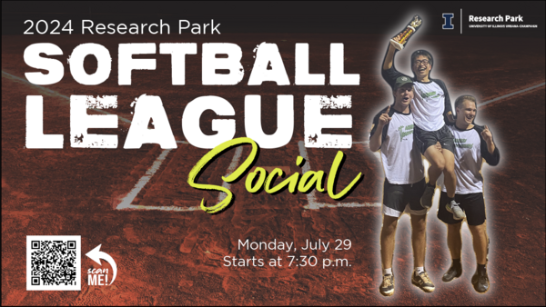 Join us for the Research Park Softball Social on Monday, July 29 at 7:30 p.m. at Zahnd Park's North Field. We will have food, drinks, the first place trophy presentation, and hitting, running, and throwing contests. Registration encouraged: https://forms.illinois.edu/sec/961195061