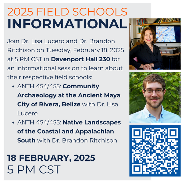 We are hosting two field schools during summer 2025! You can learn about each by attending this informational on Tuesday, February 18, 2025 at 5 PM CST in Davenport Hall Room 230. Facilitated by Dr. Lisa Lucero and Dr. Brandon Ritchison you will learn about their respective field schools.