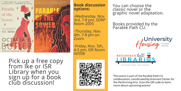 Please join us for a discussion of Octavia E. Butler's _Parable of the Sower_. While supplies last, students who sign up to participate can pick up a free copy of the novel or graphic novel adaptation at Ikenberry or ISR Library (M-F Noon-6:30pm).