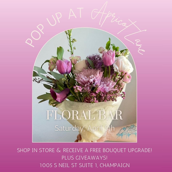 Stop in to Apricot Lane on Saturday, April 5th any time between 10am and 5pm to create your very own unique bouquet of flowers with this pop up floral bar provided by Three Berry Flowers. Don't forget to check out all the fun items at Apricot Lane while you are there!
