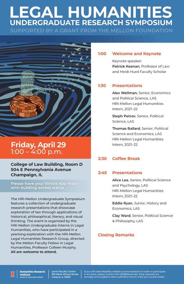 The HRI-Mellon Undergraduate Symposium features a collection of undergraduate research presentations that showcase exploration of law through applications of historical, philosophical, literary, and visual thinking. The event is organized by the HRI-Mellon Undergraduate Interns in Legal Humanities, who have participated in a yearlong exploration with the HRI-Mellon Legal Humanities Research Group, directed by the Mellon Faculty Fellow in Legal Humanities, Professor Colleen Murphy. All are welcome to attend.