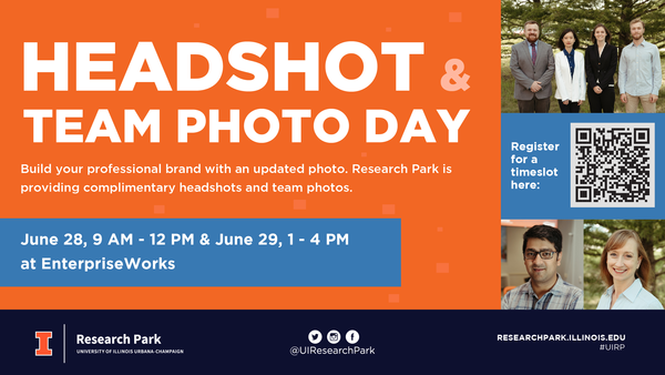 An updated headshot is important to build your personal brand in the workplace. Updated team photos are great for updating websites and social media pages with your company's most important asset - its people. The Research Park has hired Champaign-based professional photographer Anna Longworth to take headshots and team photos at EnterpriseWorks on June 29 between 1-4pm.