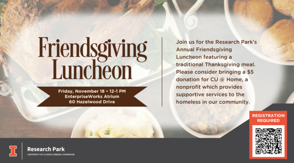 Join us for the Research Park’s Annual Friendsgiving Luncheon featuring a traditional Thanksgiving meal from Harvest Market (sliced turkey, sage stuffing, mashed potatoes + gravy, green bean casserole, rolls and pumpkin pie). Please consider bringing a $5 donation for our designated charitable organization this year—CU @ Home, a nonprofit which provides supportive services to the homeless in our community. To learn more, visit their website: https://www.cuathome.us/