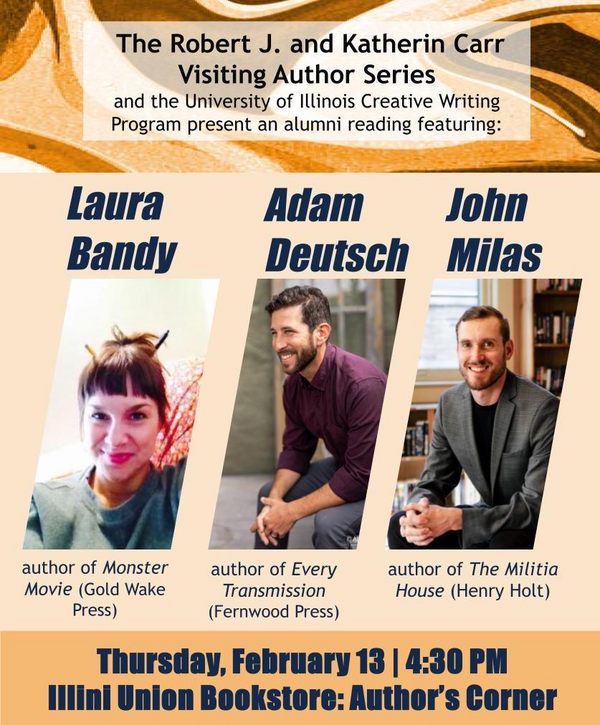 A poetry reading by Alumni of the Creative Writing Program at the University of Illinois at Urbana-Champaign. Made possible by the Robert J. and Katherin Carr visiting author series. Featuring Laura Bandy, John Milas, Adam Deutsch.