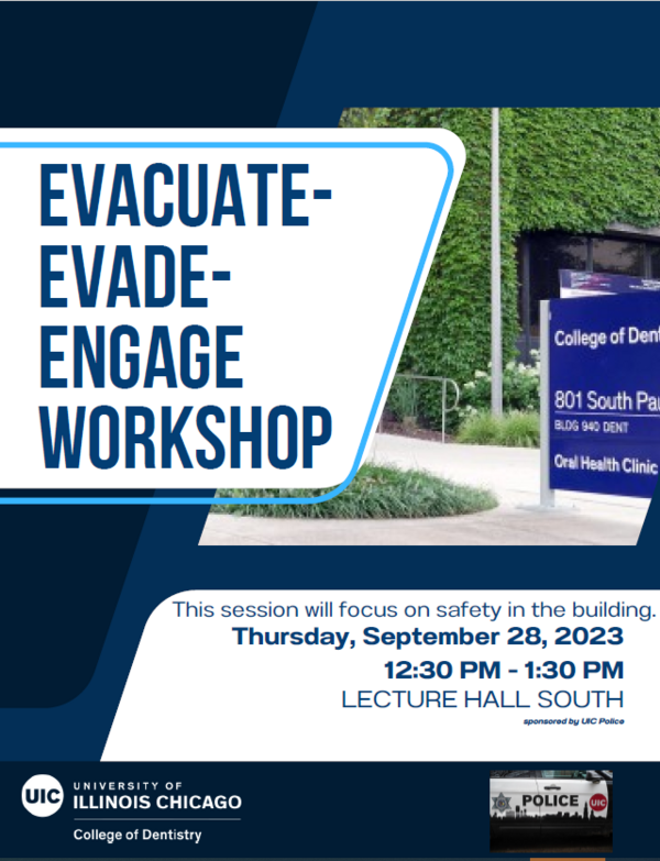 Please join us on Thursday, September 28 for the College's next safety workshop titled " Evacuate - Evade - Engage". The workshop will be held in Lecture Hall South from 12:30 - 1:30pm and hosted by the UIC Police.