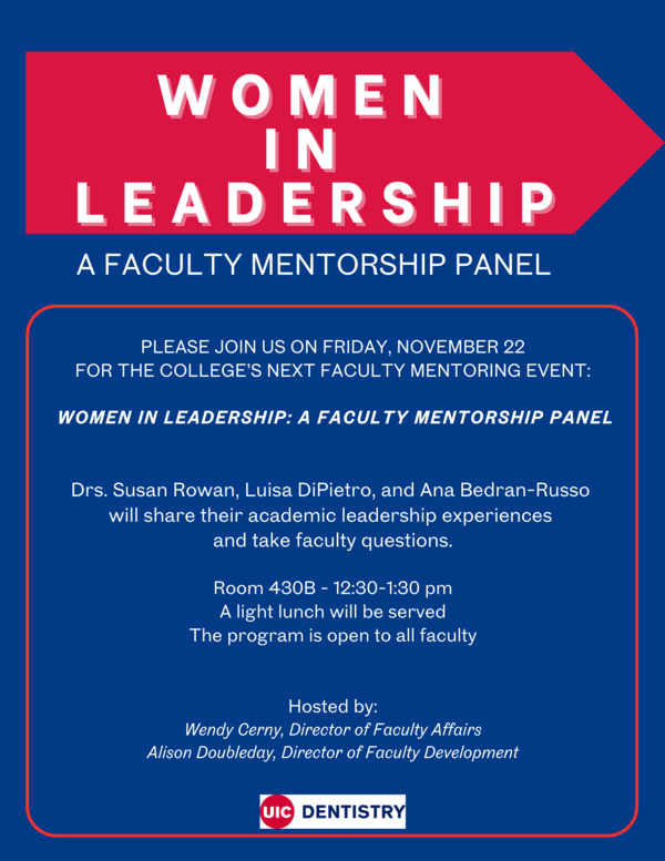 Drs. Susan Rowan, Luisa DiPietro, and Ana Bedran-Russo will share their academic leadership experiences and take faculty questions.