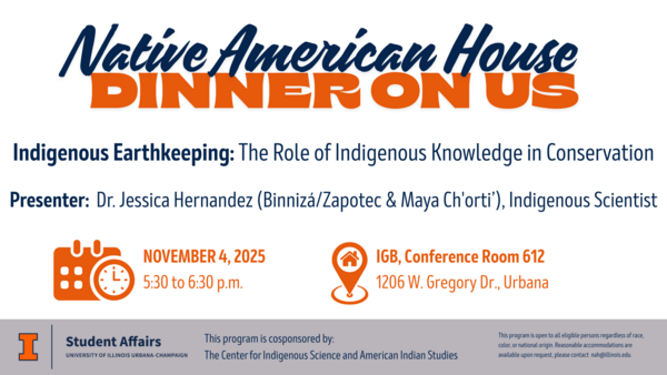 This program is open to all eligible persons regardless of race, color or national origin. Reasonable accommodations are available upon request, please contact the Native American House at nah@illinois.edu.