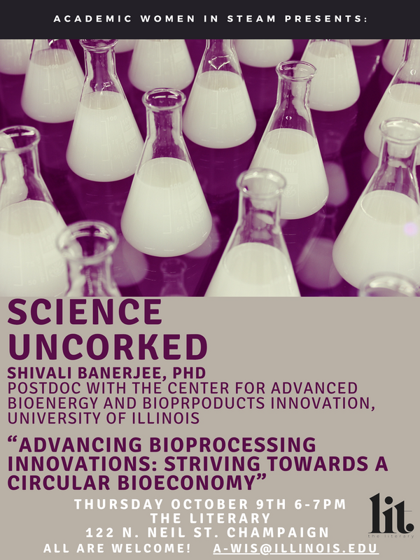 122 N Neil St. Champaign, IL 61820Please join Academic Women in STEAM (A-WIS) as we continue our monthly public seminar series, Science Uncorked. Our next seminar event will be Thursday October 9th at 6 pm at The Literary in downtown Champaign.