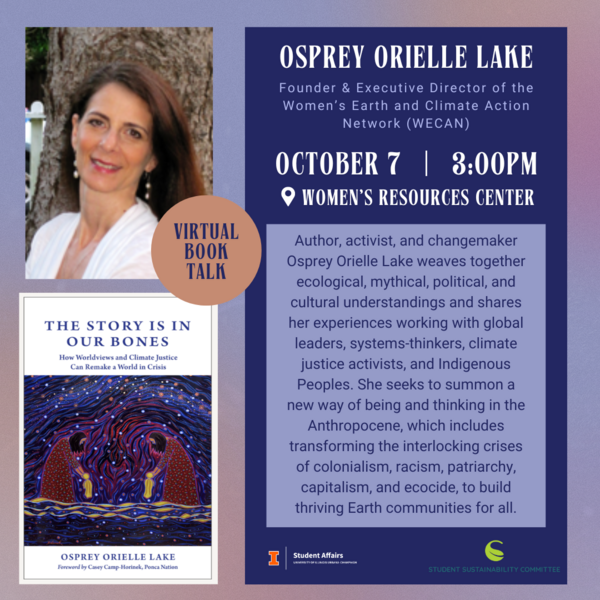 Join us as we (virtually) welcome Osprey Orielle Lake, Founder & Executive Director of the Women's Earth and Climate Action Network (WECAN). She will speak on her newly published book "The Story is in Our Bones: How Worldviews and Climate Justice Can Remake a World in Crisis."