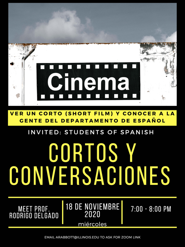 Hola. Meet us on Zoom for an informal get-together among Illinois Spanish students. We will chat, get to know one of our faculty members, Prof. Rodrigo Delgado, and watch a short film in Spanish together. Te invitamos a pasar un rato juntos, conversando y viendo un cortometraje en español.