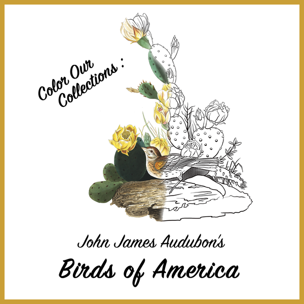 This coloring book includes a selection of images that have been translated to line drawings from John James Audubon’s Birds of America folio. The Rare Book & Manuscript Library at the University of Illinois at Urbana-Champaign proudly holds a complete original set of this monumental work in our collection.