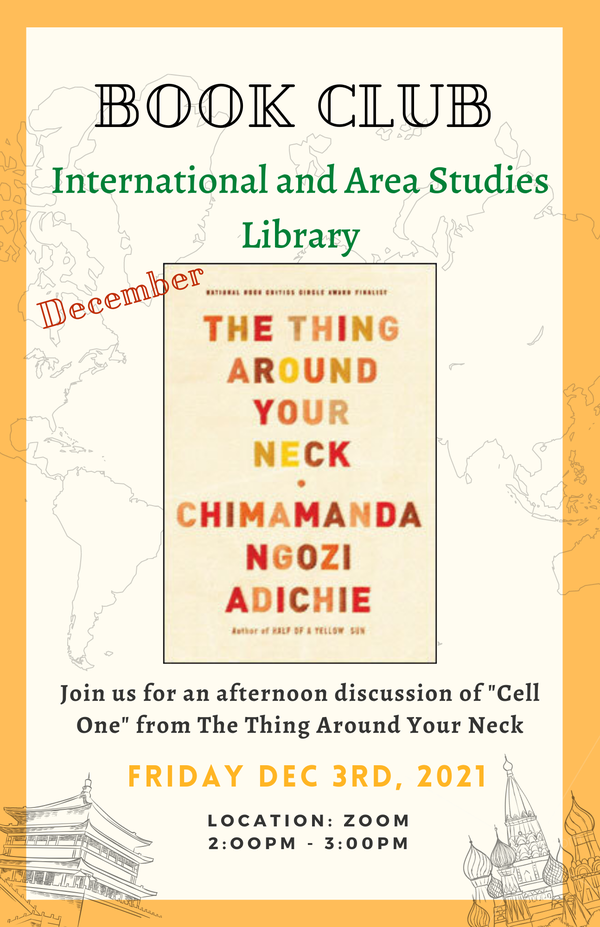 Join the International and Area Studies Library for a monthly discussion of international novels and short stories selected by area specialist librarians! For the month of December, the club will be discussing "Cell One" by Nigerian writer Chimamanda Ngozi Adichie.