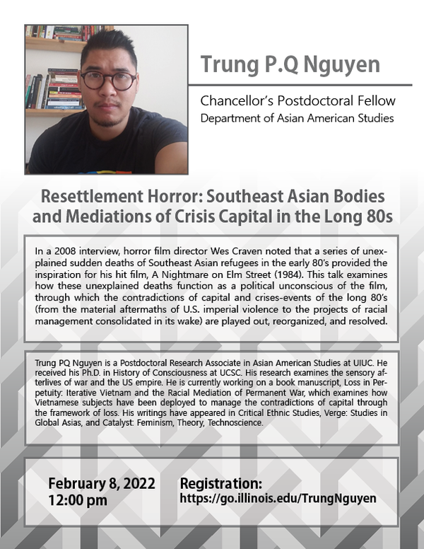In a 2008 interview, horror film director Wes Craven noted that a series of unexplained sudden deaths of Southeast Asian refugees in the early 80’s provided the inspiration for his hit film, A Nightmare on Elm Street (1984). This talk examines how these unexplained deaths function as a political unconscious of the film, through which the contradictions of capital and crises-events of the long 80’s (from the material aftermaths of U.S. imperial violence to the projects of racial management consolidated in its wake) are played out, reorganized, and resolved.