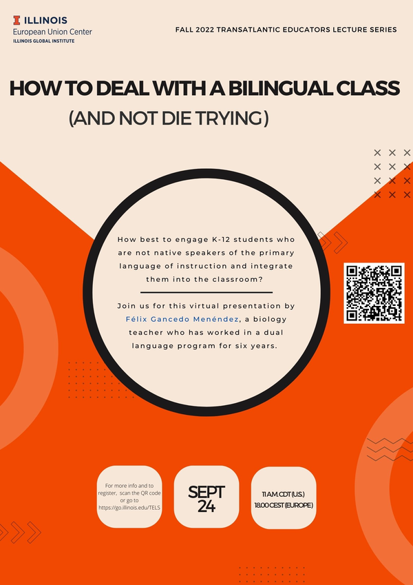 How best to engage K-12 students who are not native speakers of the primary language of instruction and integrate them into the classroom? Register for this virtual presentation by Félix Gancedo Menéndez, a biology teacher who has worked in a dual language program for six years. This presentation is part of the European Union Center's Transatlantic Educators Lecture Series, where K-12 educators from Europe and the U.S. present on salient topics in education.