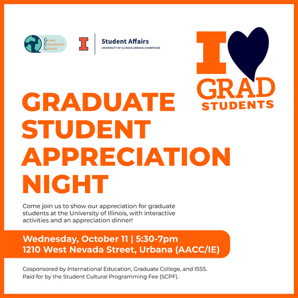 Come join us to show our appreciation for graduate students at the University of Illinois, with interactive activities and an appreciation dinner! Paid for by the Student Cultural Programming Fee (SCPF).