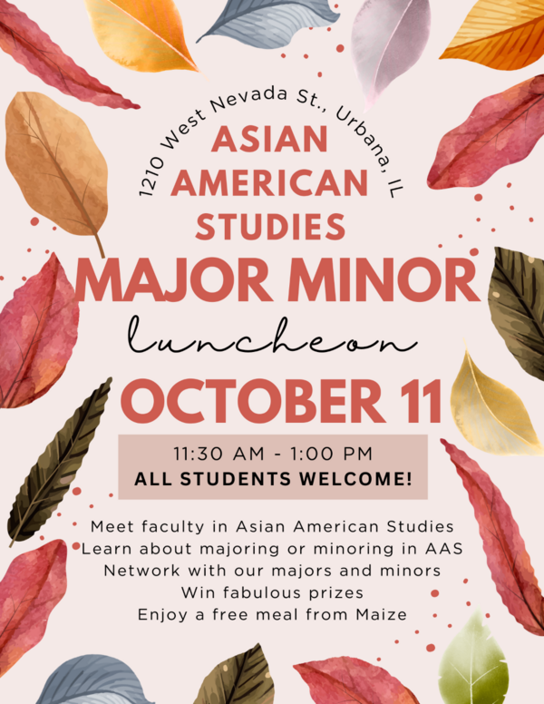 The Asian American Studies Department is hosting a Major Minor Luncheon on Wednesday, October 11th from 11:30-1:00. Please stop by the Asian American Cultural Center for free food catered by Maize and the chance to win fabulous prizes. This event is a great opportunity to network with faculty and students from the AAS department and learn more about its programming.