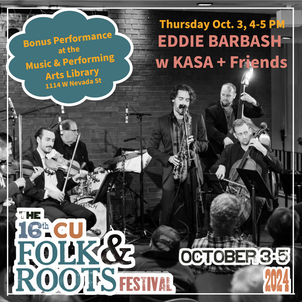 Join us for an afternoon of music and insight in collaboration with the CU Folk & Roots Festival! Experience a captivating performance/lecture by Eddie Barbash + KASA & Friends, browse a curated display of folk and roots materials from the Music & Performing Arts Library's collections, and enjoy light refreshments.
