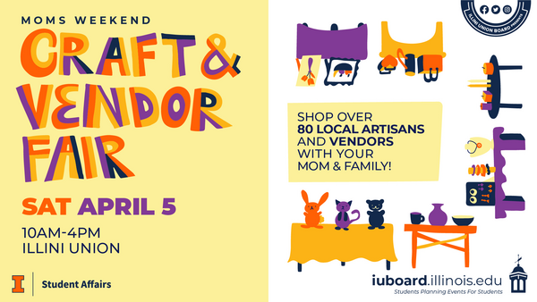 The student run Illini Union Board is hosting a huge craft and vendor fair in the Illini Union on the Saturday of Moms Weekend. Stop by to see what treasures you might find! The Illini Moms will be located in the north lounge with a few items for sale including our Moms Weekend 2025 shirts and sweatshirts.