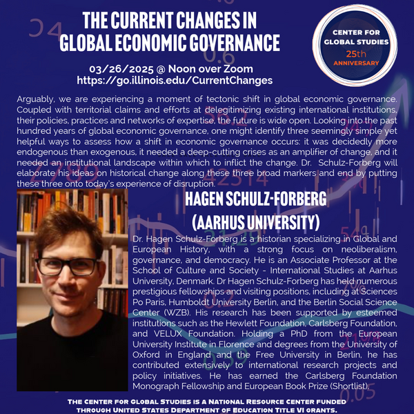 CGS regrets that Prof. Hagen Schulz-Forberg talk, originally scheduled for today, March 26th, has to be postponed. CGS hopes to reschedule the talk for later in this semester. The new date will be announced on the CGS website: https://cgs.illinois.edu/news/2025-03-14t193240/postponed-current-changes-global-economic-governance