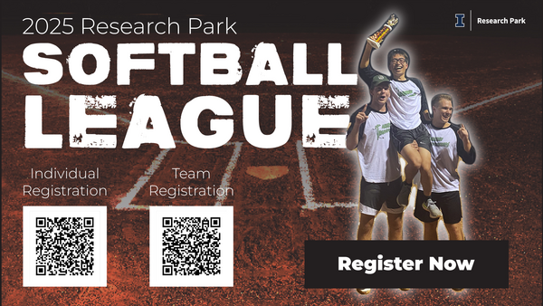 Come out and support your company's team at the 2025 Research Park Summer Softball League. Research Park teams and individuals registered in May will play games on Monday evenings from June 2 to July 21 at the University of Illinois Complex Fields in Champaign. Learn more on the Research Park website.