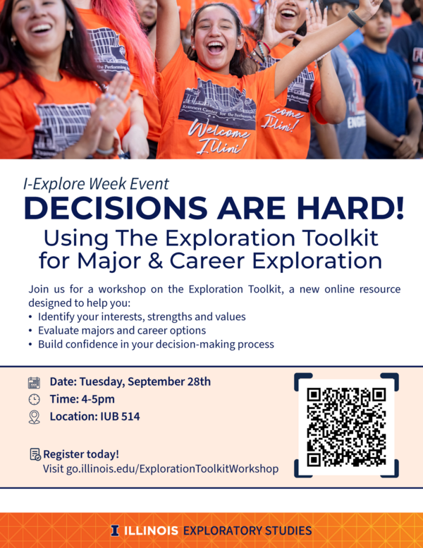 Are you feeling uncertain about your major or career path? Join us for an interactive workshop where you'll get hands-on experience with a new Exploratory Studies resource: The Exploration Toolkit! This session will help you explore yourself, your options, and your decision-making through a collection of resources from the Exploration Toolkit. Whether you're figuring out your next steps or just looking to gain more clarity, this workshop is designed to support you in your unique academic and professional journey. Don’t miss out on this opportunity to take charge of your future with the Exploration Toolkit (no wrenches required)!