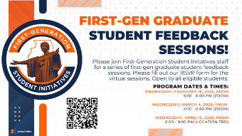 Join the FGSI team for a casual conversation about how our unit can grow in programming, support, and build community among first-gen graduate students at Illinois. The first two sessions will be over Zoom and will require an RSVP (https://go.illinois.edu/FGSIGrad). Please email us for any access needs outside of Zoom captions or any questions!