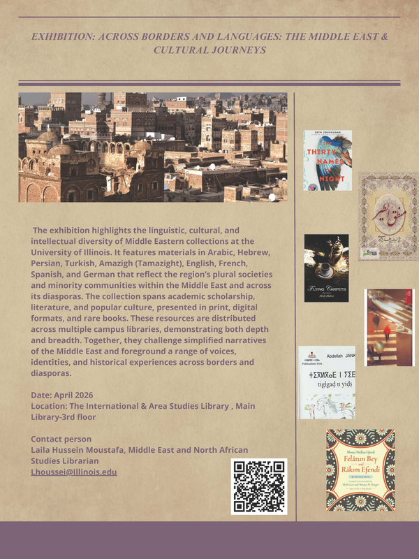 The exhibition highlights the linguistic, cultural, and intellectual diversity of Middle Eastern collections at the University of Illinois. It features materials in Arabic, Hebrew, Persian, Turkish, Amazigh (Tamazight), English, French, Spanish, and German that reflect the region’s plural societies and minority communities within the Middle East and across its diasporas. The collection spans academic scholarship, literature, and popular culture, presented in print, digital formats, and rare books. These resources are distributed across multiple campus libraries, demonstrating both depth and breadth. Together, they challenge simplified narratives of the Middle East and foreground a range of voices, identities, and historical experiences across borders and diasporas.