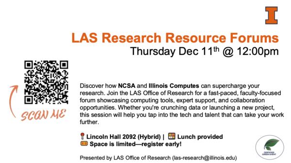 Discover how NCSA and Illinois Computes can supercharge your research. Join the LAS Office of Research for a fast-paced, faculty-focused forum showcasing computing tools, expert support, and collaboration opportunities. Whether you're crunching data or launching a new project, this session will help you tap into the tech and talent that can take your work further.