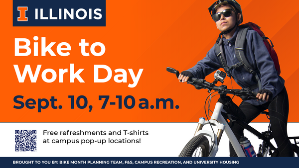 The Champaign County Bike Month Planning team is organizing Bike to Work Day on Wednesday, September 10, 2025 from 7-10 am across Champaign County! There are a total of 16 welcoming stations in the Champaign County this year, of which eight (8) will be on the U. of I. campus.