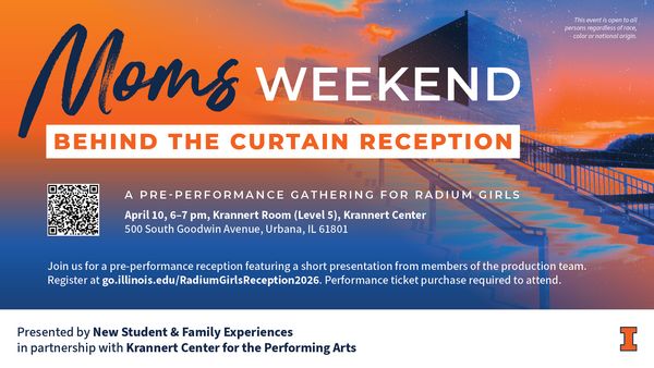 - Purchase your performance ticket here for the performance on Friday, April 10, 2026. Use promo code MOM, in the upper right-hand corner of the website. Tickets to the performance must be purchased separately. A limited number of tickets are available at a discounted rate. This event is presented by New Student & Family Experiences in partnership with Krannert Center for the Performing Arts. This event is also made possible through the support of the University of Illinois Parent Fund. When you purchase a reception ticket, you directly contribute to this fund, helping ensure that essential services and resources remain available to enrich the overall learning experience of our students.
