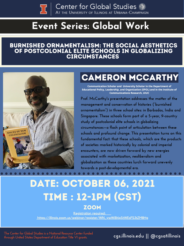 Prof. Cameron McCarthy (Communication Scholar and University Scholar in the Department of Educational Policy, Leadership, and Organization (EPOL) and in the Institute of Communications Research, UIUC) will give a presentation that addresses the matter of the management and conservation of histories (“burnished ornamentalism”) in three school sites: in Barbados, India and Singapore respectively. These schools form part of a 5-year, 9-country study of postcolonial elite schools in globalizing circumstances—a flash point of articulation between these schools and profound change. This presentation turns on this fundamental fact: that these schools, which are the products of societies marked historically by colonial and imperial encounters, are now driven forward by new energies associated with marketization, neoliberalism and globalization as these countries lurch forward unevenly towards a post-developmental era.