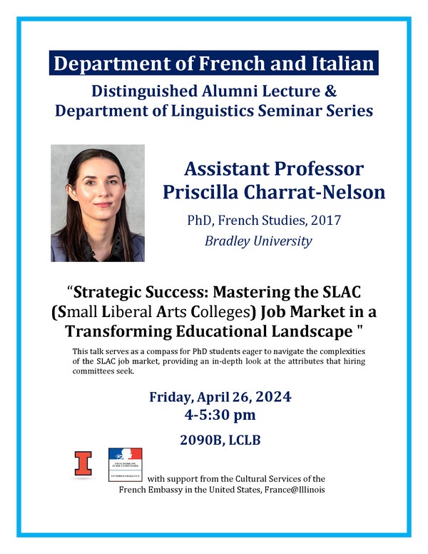 In today’s rapidly evolving academic environment, landing a position at a Small Liberal Arts College (SLAC) requires more than impeccable academic credentials; it demands a strategy that is meticulously tailored and demonstrates a solid understanding of what a tenure-track job at a SLAC concretely entails. This talk serves as a compass for PhD students eager to navigate the complexities of the SLAC job market, providing an in-depth look at the attributes that hiring committees seek. In this talk, not only will I share how I secured four tenure-track offers in this year's competitive job market, but I will also draw on my experience serving on hiring committees for positions in French, Spanish, Arabic, and German.