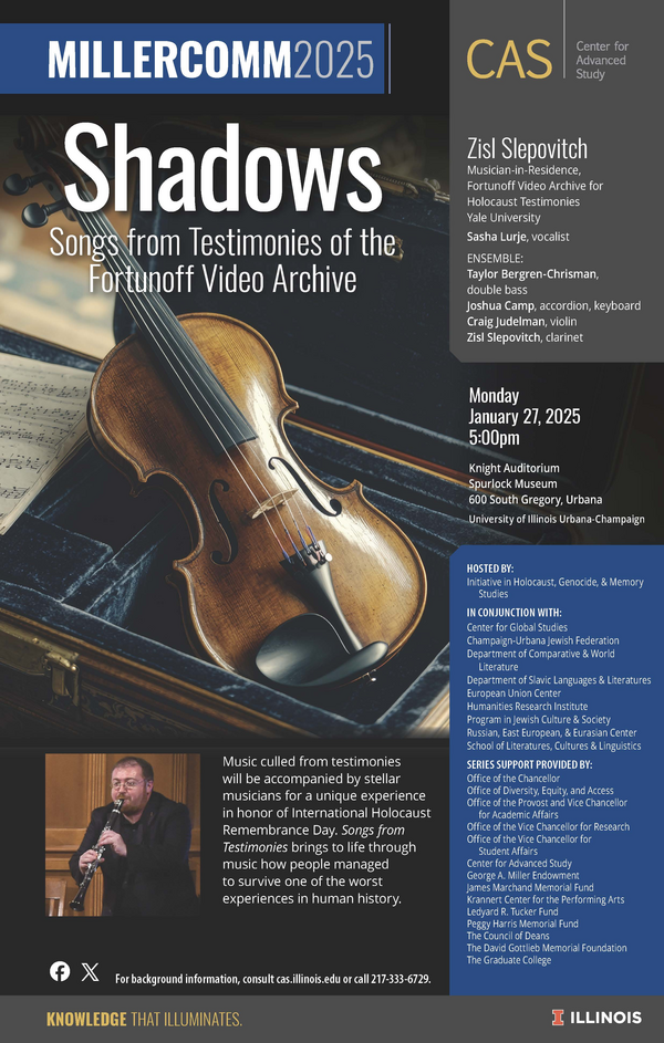 The Initiative in Holocaust, Genocide, Memory Studies invites you to our International Holocaust Remembrance Day event, January 27th at 5pm at the Spurlock Museum, featuring Zisl Slepovitch and songs culled from Holocaust testimonies. This will be a moving and important testament to the power of music in the worst conditions. If you are a student please join Zisl for lunch at 12:30 on January 27th in 109 English; if you are teaching, please invite your students to join him for lunch. RSVP for lunch to Leslie Davison, ldp@illinois.edu.