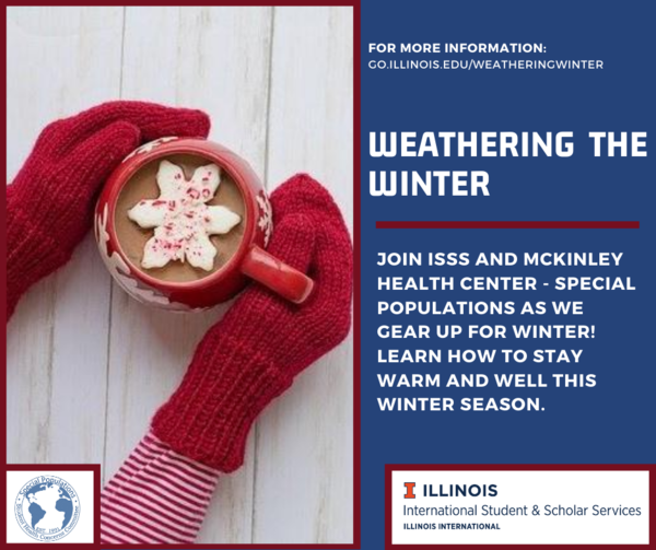 Join ISSS and the McKinley Health Center - Special Populations as we gear up for Winter! Central Illinois winters can be cold and difficult to imagine if you have not experienced them before. Be sure to come to Weathering the Winter to learn how to stay warm and well this winter season!