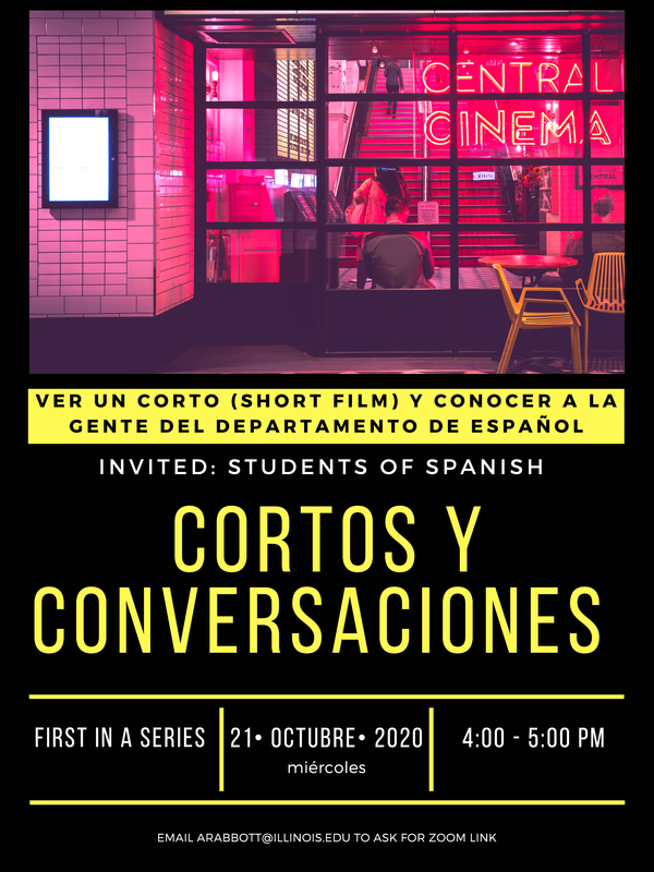 Hola. Meet us on Zoom for an informal get-together among Illinois Spanish students. We will chat, get to know one of our faculty members, Dr. Anna Torres Cacoullos, and watch a short film in Spanish together. Te invitamos a pasar un rato juntos, conversando y viendo un cortometraje en español.