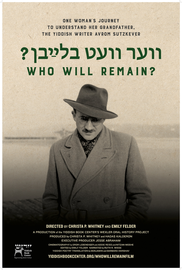 From 2-3 we will screen the film Ver Vet Blaybn? (Who Will Remain?) which traces the story of the amazing Yiddish poet Avraham Sutzkever. From 3-4 we will first hear from Sutzkever’s granddaughter Hadas Kalderon, then filmmaker Christa P. Whitney, and then Sutzkever scholar Justin Cammy. After these speakers, we will open up to Q & A from the audience.