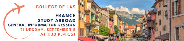 See all that life in France has to offer! In this information session, hosted by LAS International Program and Department of French and Italian, students will have the opportunity to explore various French programs, view housing options, and learn about expected coursework. With plenty of opportunities to ask questions, if studying abroad in France is of interest, you won't want to miss this session!